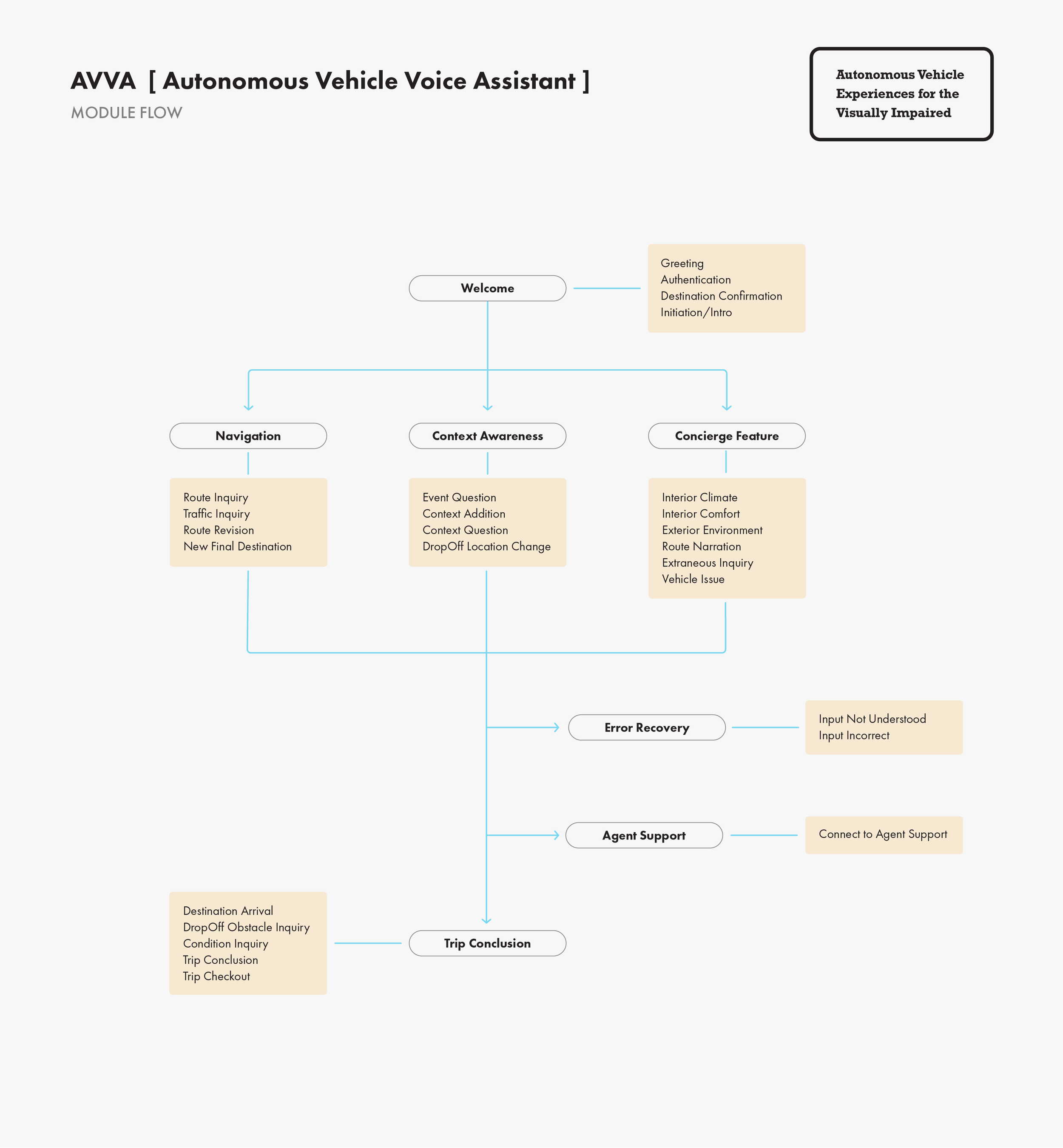 AVVA (Autonomous Vehicle Voice Assistant) is a conversational user interface that provides independence, agency, and efficiency to visually impaired users by giving them a method to interact with a shared autonomy ride, pickup to drop-off.